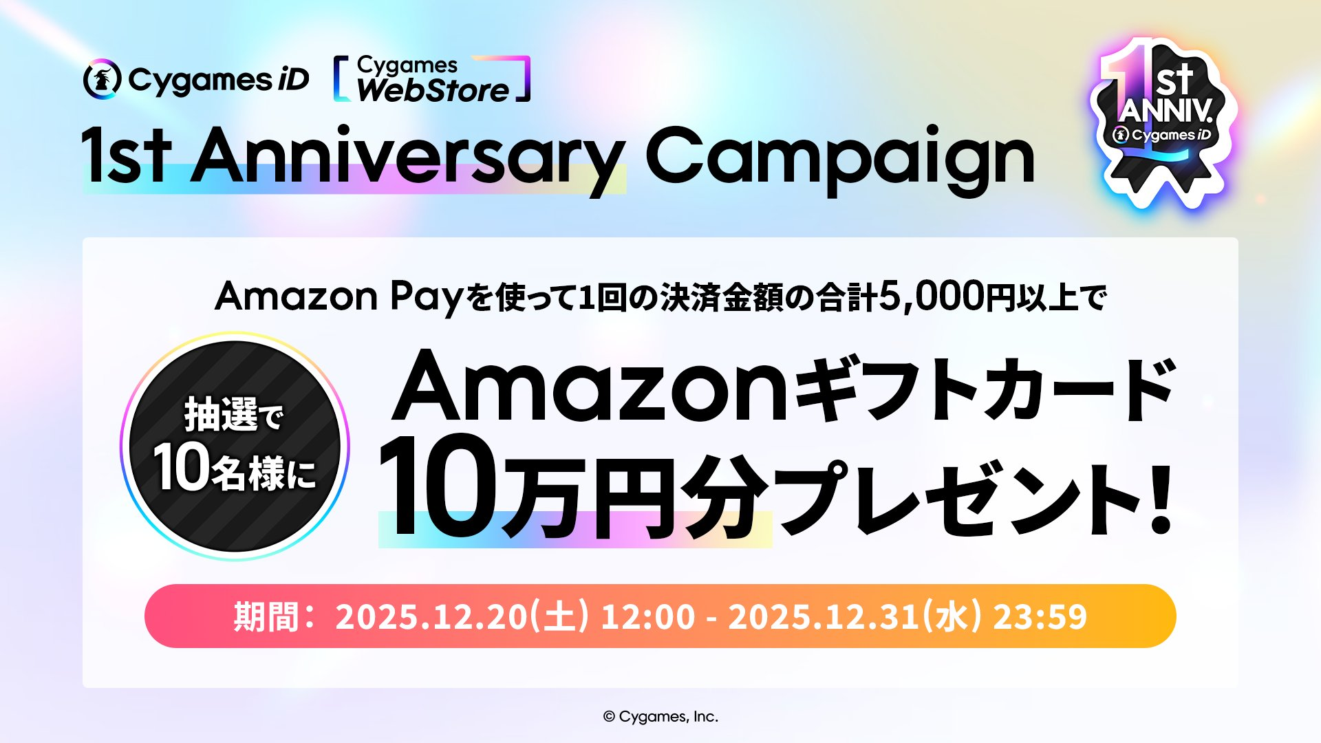 キャンペーン期間中にCygames WebStoreにてAmazon Pay決済かつ1回の購入で合計5,000円以上購入することで、抽選で10名様に10万円分のAmazonギフトカードが当たります。