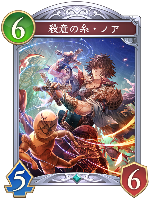 ![]() | 自分がカードをプレイしたとき、【コンボ_5】自分のターンごとに1回、相手の場のフォロワーすべては-0/-2する。 相手のフォロワーの体力が場で-されたとき、自分のターンごとに1回、自分の手札からランダム1枚のコストを-1する。 |