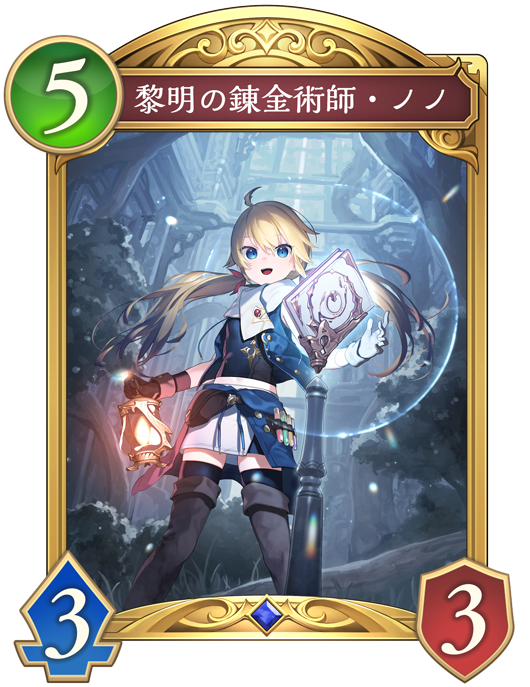 ![]() | 自分のターン開始時、ターン数が5以上なら、バトル中に1回、自分は『黎明の錬金術師・ノノ』を持つ。 |