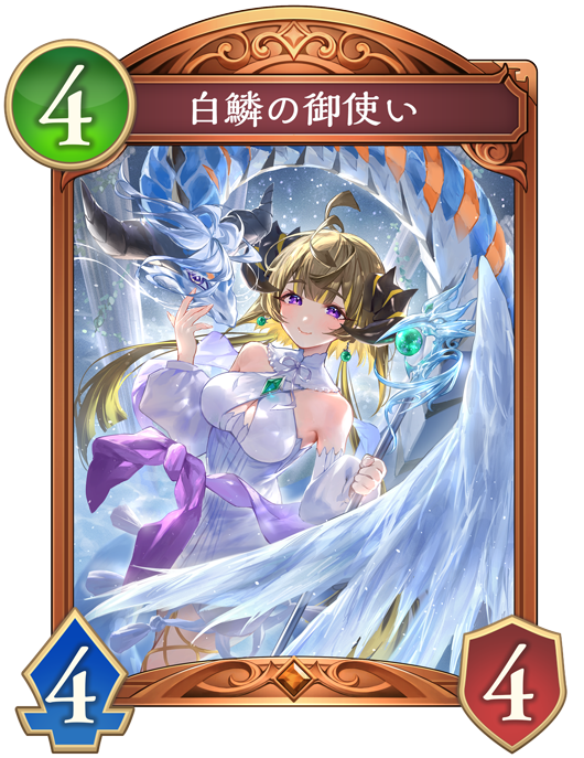![]() | 自分のフォロワーが進化したとき、自分のターンごとに1回、相手の場のフォロワーすべてに1ダメージ。 自分のターン開始時、ターン数が1なら、『銀氷の吐息』1枚を自分の手札に加える。それのコストを0にする。 |