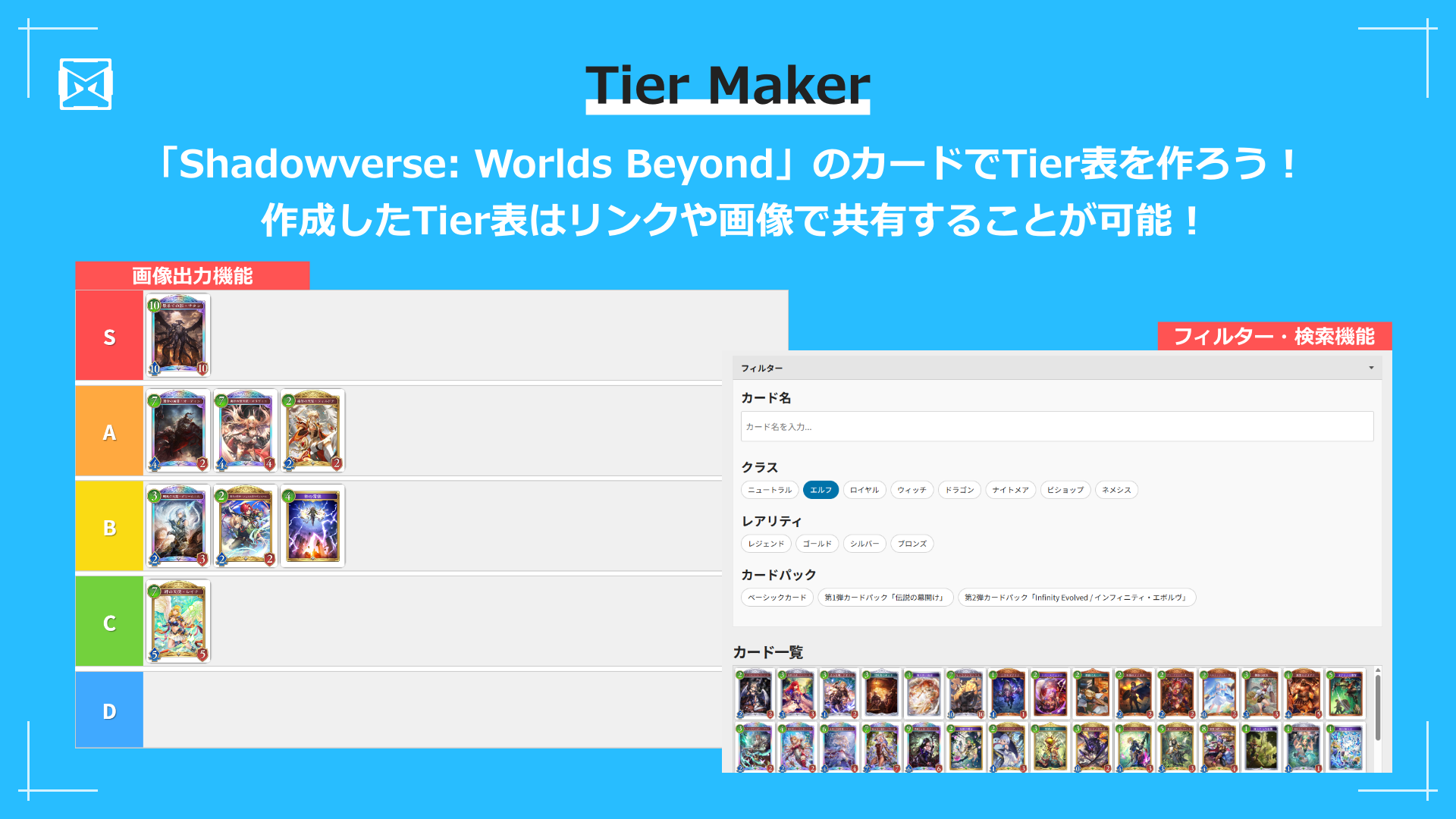 「シャドバダンジョン エクスプロア」に登場する加護のTier表を作成しよう!シャドバWBのカードやクラスをドラッグ&ドロップするだけでTier表を作成できるTier Makerを公開中ですのでご活用ください。