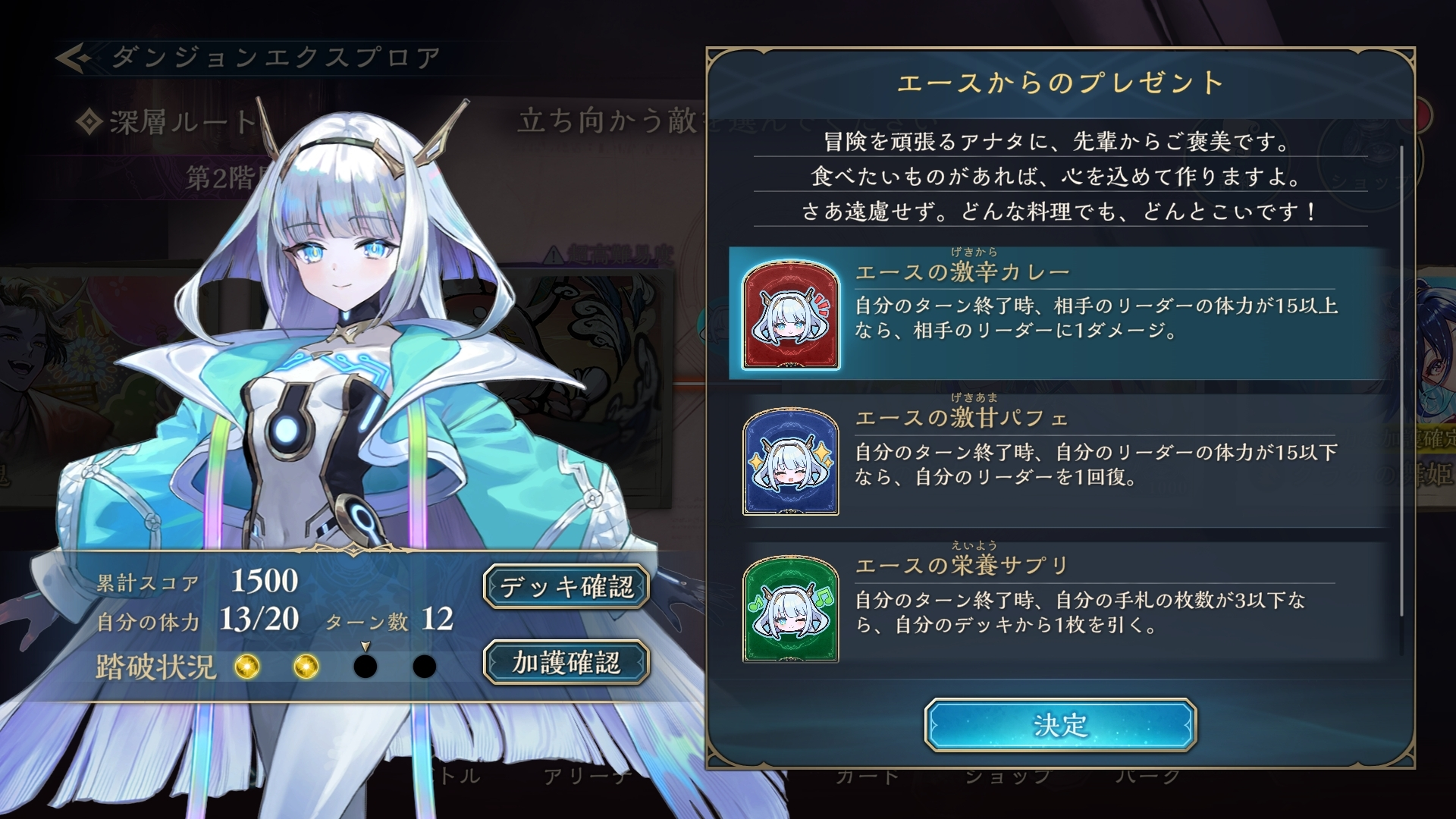 深層ルートの第3階層開始前に「エースからのプレゼント」として3種類の加護から1つを受け取ることができます。