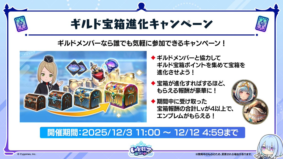 ギルドメンバーと協力してギルド宝箱ポイントを集めて宝箱を進化させよう!期間中に受け取った宝箱報酬の合計Lvが4以上でエンブレムが貰える!