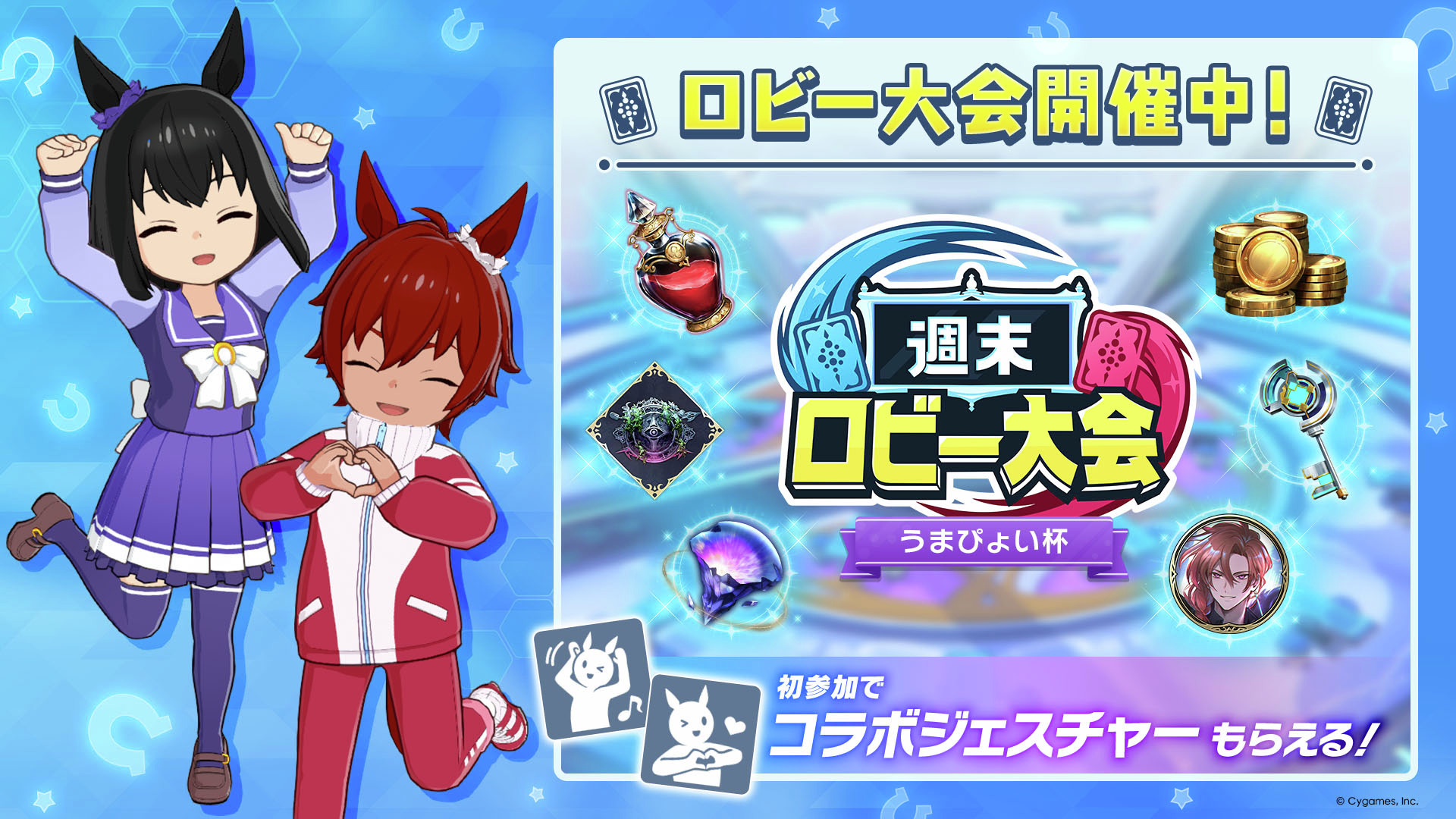 ミニコラボ開催期間中の週末ロビー大会は「うまぴょい杯」が行われます。参加報酬としてコラボジェスチャー「うまぴょい伝説」2種を獲得することができます。