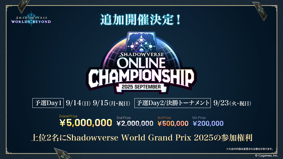 「Shadowverse Online Championship 2025 August」の応募者数が定員を大幅に超える人数であったことを踏まえて、9月に「Shadowverse Online Championship 2025 September」が追加開催されることが決定しました。こちらの大会でも上位2名に「Shadowverse World Grand Prix 2025」の参加権利や賞金が贈られます。