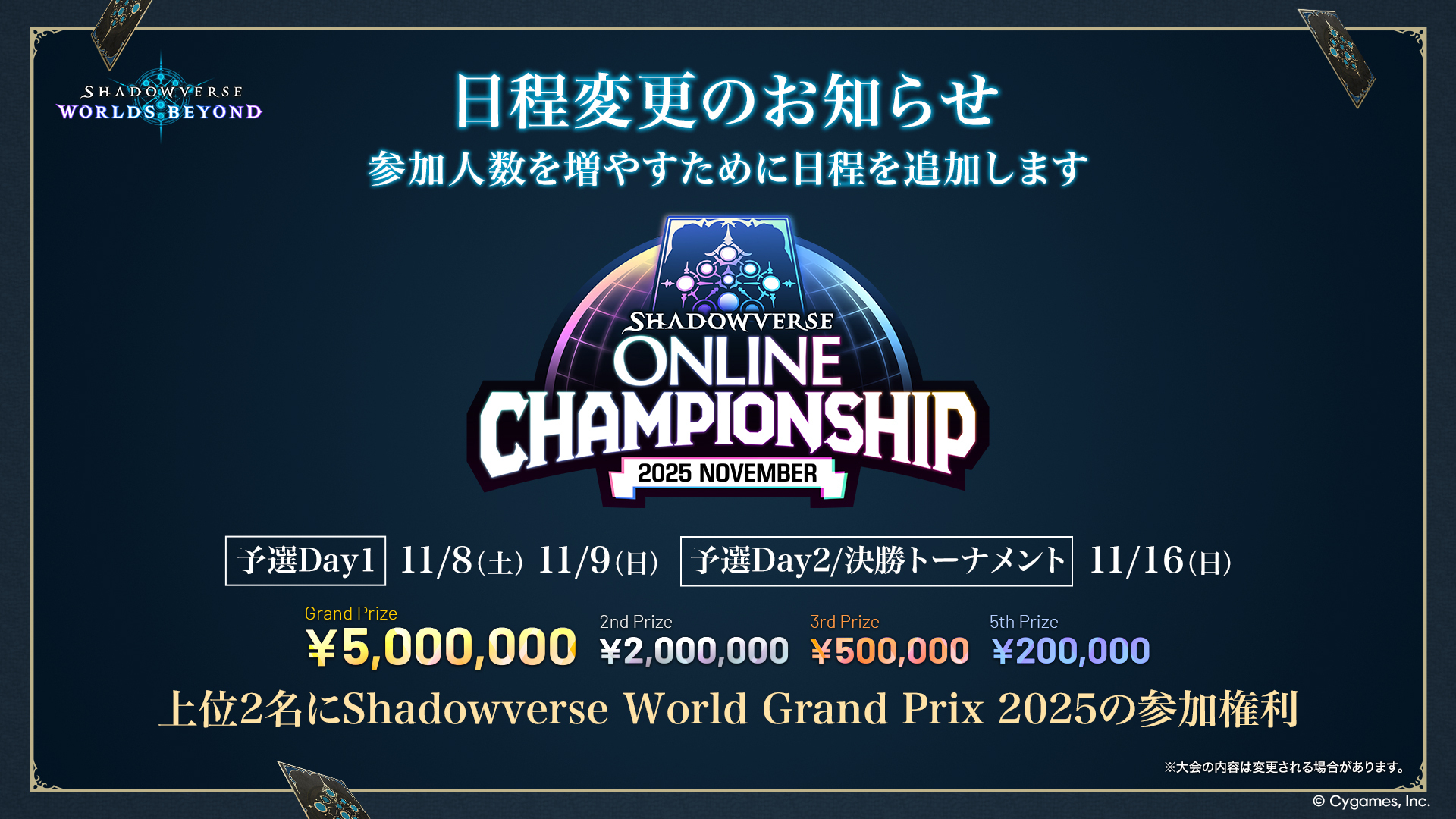 「Shadowverse Online Championship 2025 November」は11月8日(土)~9日(日)、16日(日)の3日間で行われる大型オンライン大会です。