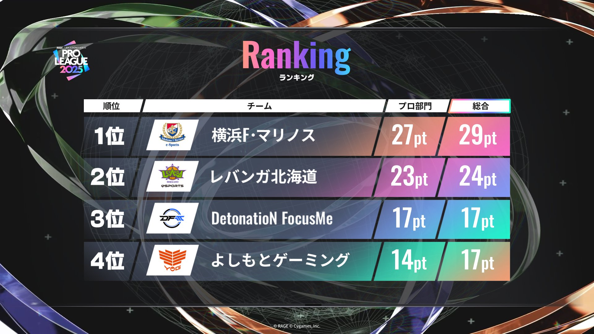 「RAGE Shadowverse Pro League 2025」はインフルエンサーを含めた総合部門の優勝を目指すリーグです。総合部門優勝チームは賞金100万円のスペシャルエキシビションマッチに招待されます。また、LCSやWGP2025の出場権についてはプロ部門の順位に応じて与えられます。